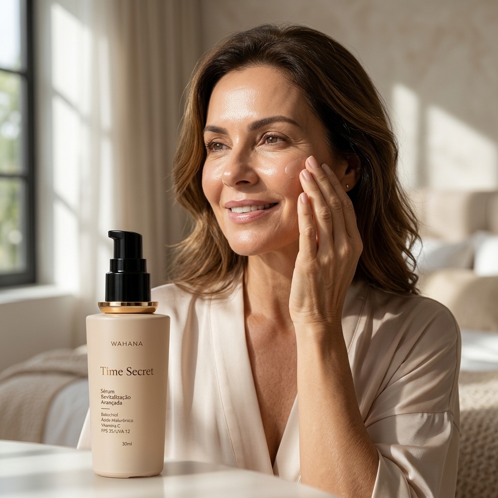 Se você está buscando o melhor do bakuchiol para pele madura, o Time Secret da Wahana Cosméticos é a nossa recomendação definitiva. Este produto foi formulado especificamente para as necessidades da mulher brasileira após os 50 anos, unindo a potência firmadora do bakuchiol a um complexo de hidratação profunda que combate o ressecamento da menopausa.