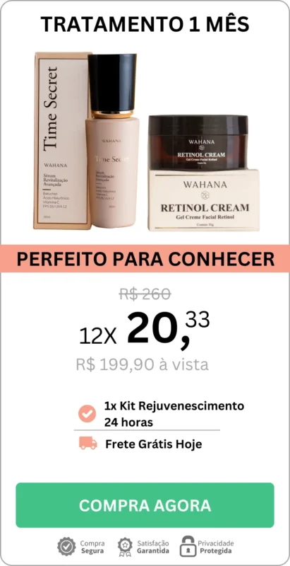 Cada embalagem contém 1 Sérum Rejuvenescedor Time Secret 30ml, 1 Wahana Retinol Cream de 30g e 1 Serum Retinol Intensive Repair Wahana 30ml.