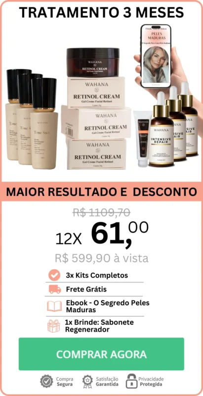 Cada embalagem contém 1 Sérum Rejuvenescedor Time Secret 30ml, 1 Wahana Retinol Cream de 30g e 1 Serum Retinol Intensive Repair Wahana 30ml.