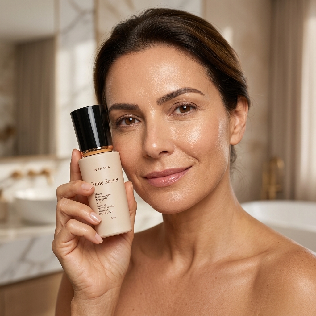 Estudos publicados no British Journal of Dermatology apontam que a espessura da derme reduz significativamente em mulheres nessa faixa etária. É aqui que produtos de alta performance, como o Time Secret, fazem a diferença, atuando no estímulo dos fibroblastos para recuperar a densidade perdida.